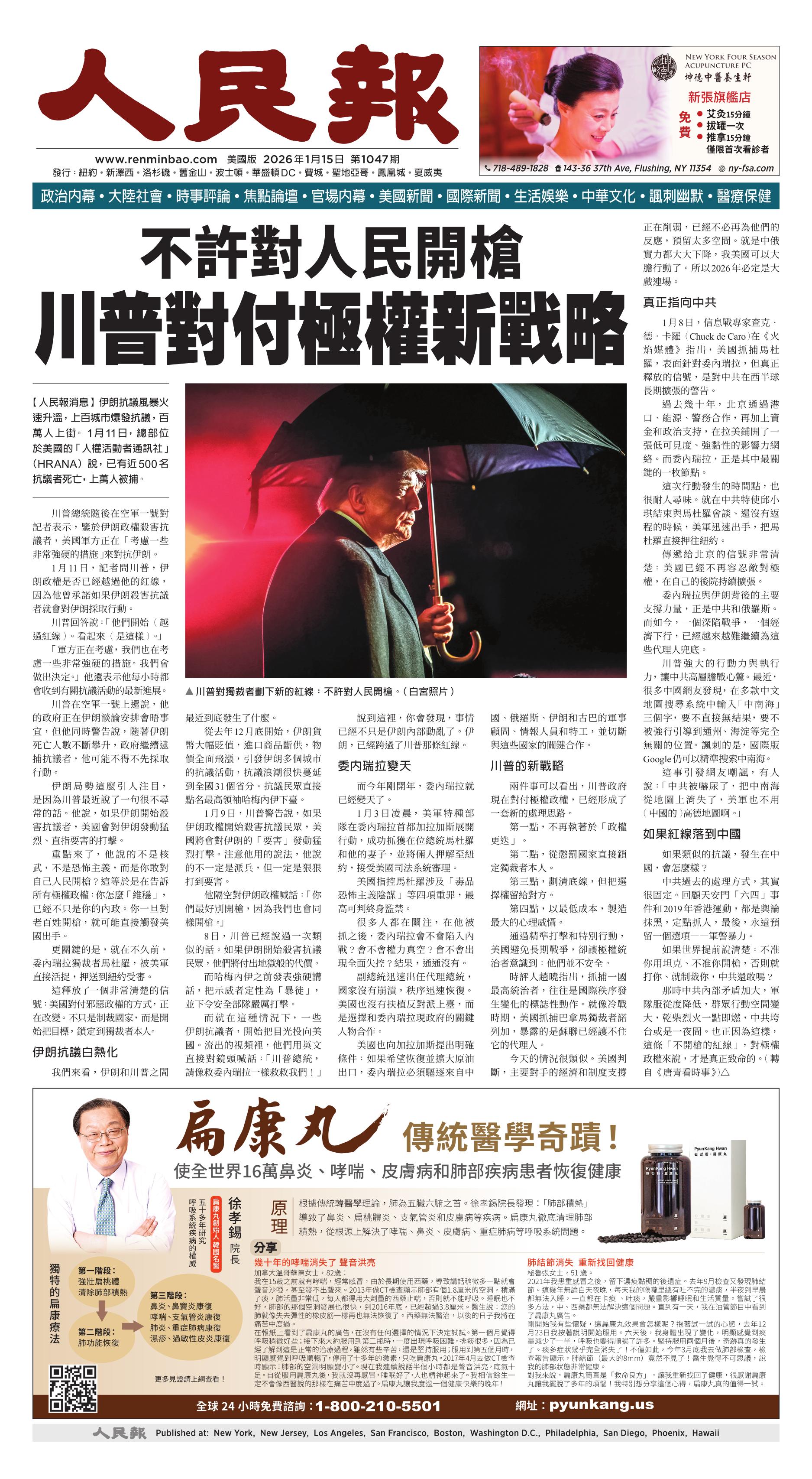 |<<  <<前一页 < 返回 第1047期  (2026年1月15日)A1版: 头版 下一页>>  >>|
