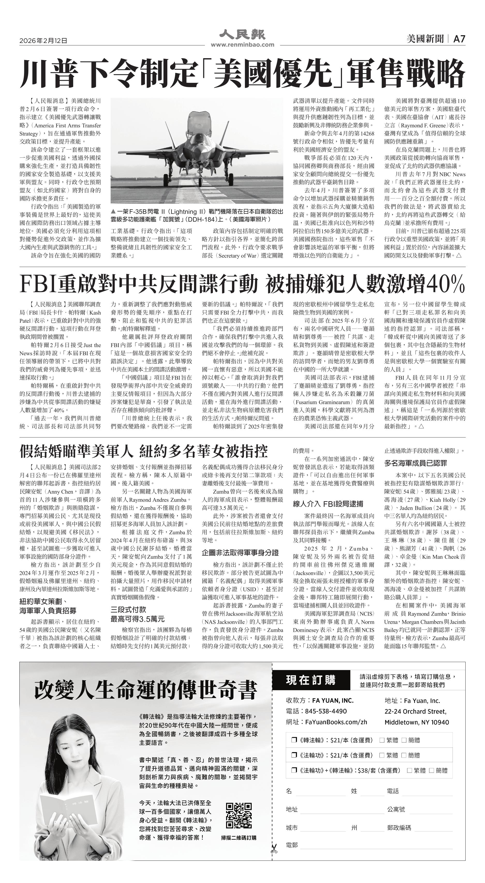 |<<  <<前一頁 < 返回 第1051期  (2026年2月12日)A7版: 美國新聞 下一頁>>  >>|