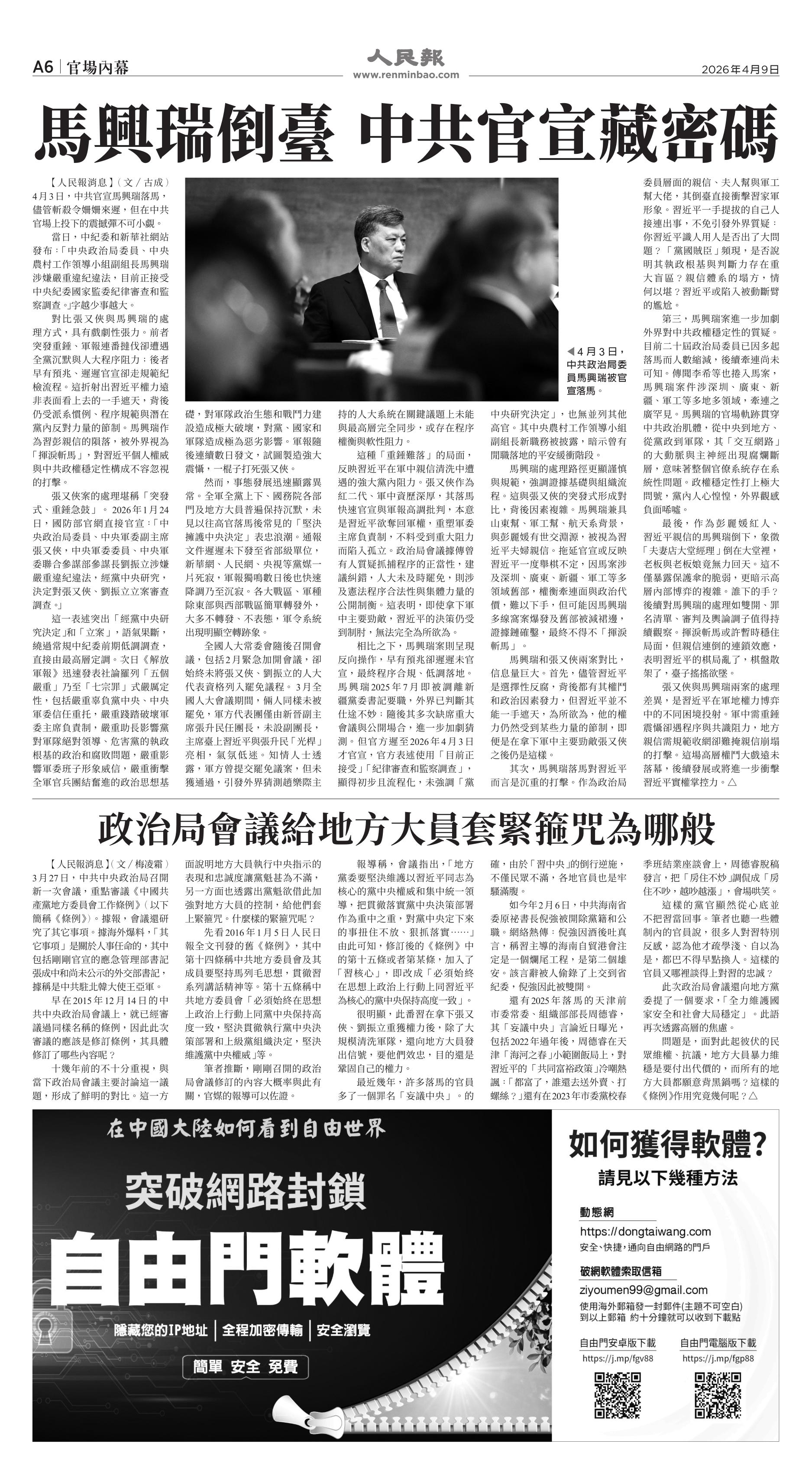 |<<  <<前一頁 < 返回 第1059期  (2026年4月9日)A6版: 官場內幕 下一頁>>  >>|