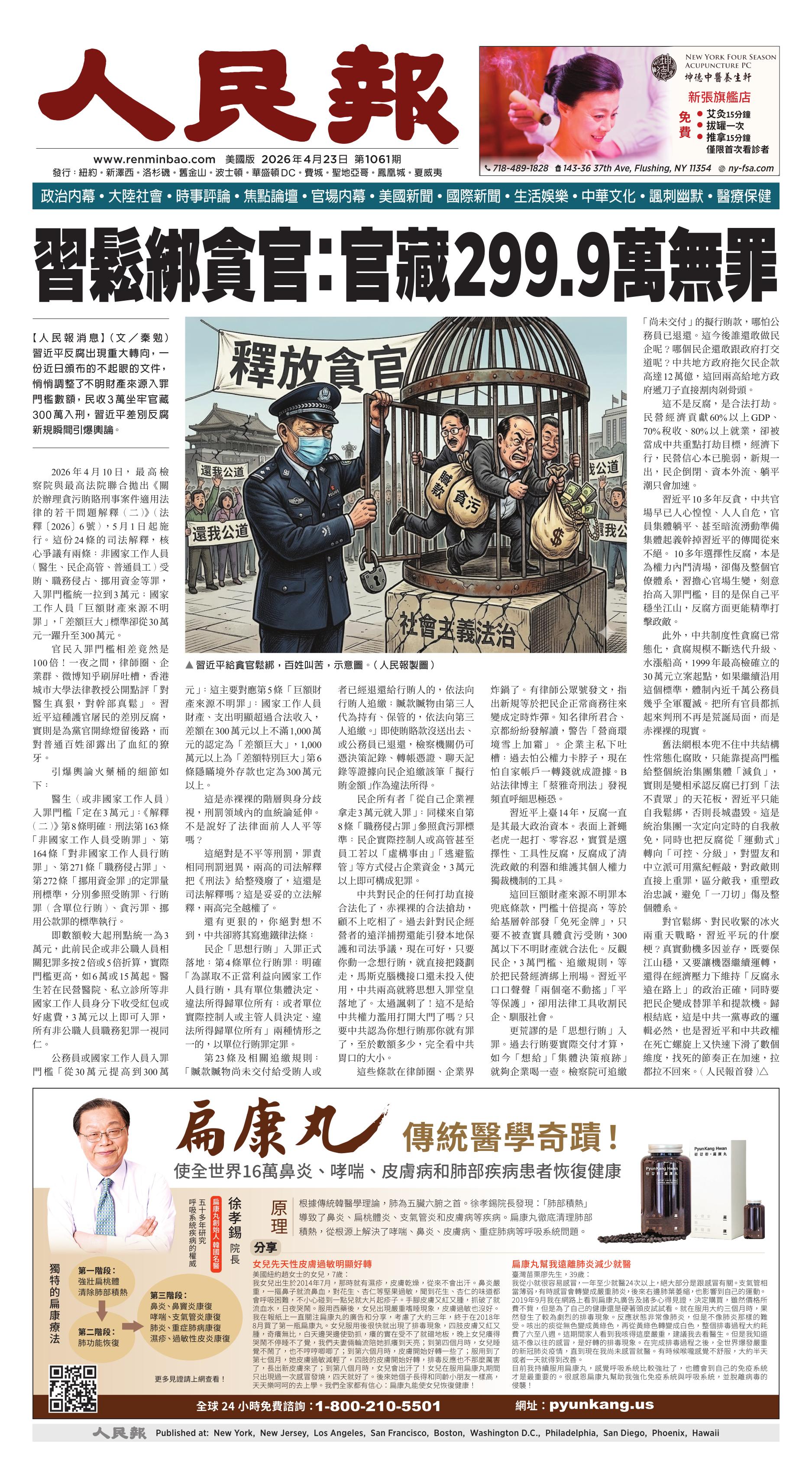 |<<  <<前一页 < 返回 第1061期  (2026年4月23日)A1版: 头版 下一页>>  >>|
