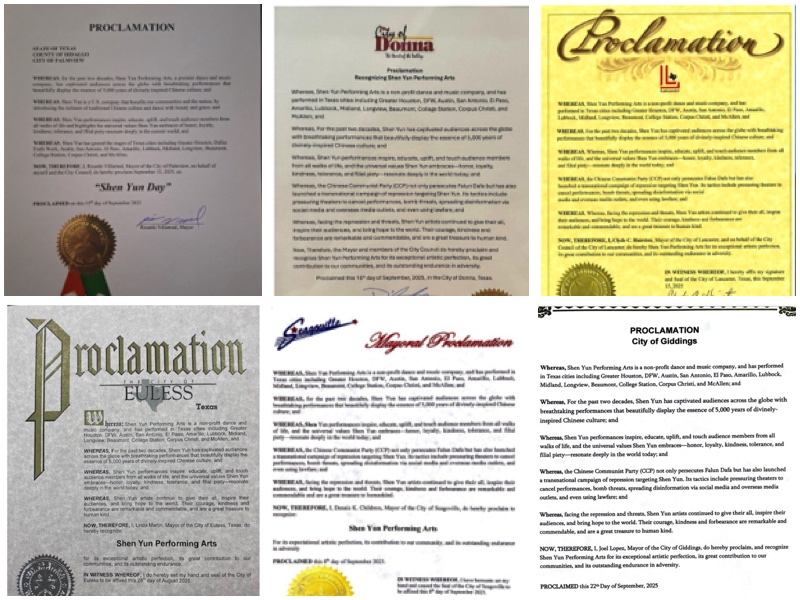 德州六城市市長褒獎神韻藝術團。市長為(從左至右,從上至下):棕櫚景市市長里卡多﹒比利亞雷亞爾(Ricardo Villarreal)、唐納市市長大衛﹒莫雷諾(David Moreno)、蘭卡斯特市市長克萊德﹒C﹒海爾斯頓(Clyde C. Hairston)、尤勒斯市市長琳達﹒馬丁(Linda Martin)、西戈維爾市長丹尼斯﹒K﹒奇爾德里斯(Dennis K. Childress)、吉丁斯市長喬﹒洛佩茲(Joel Lopez)(大紀元合成圖)