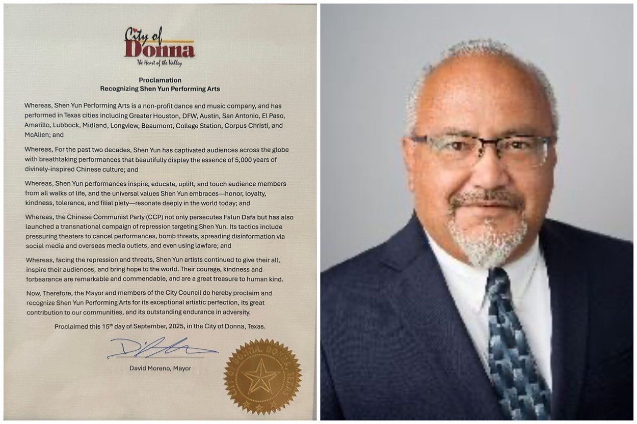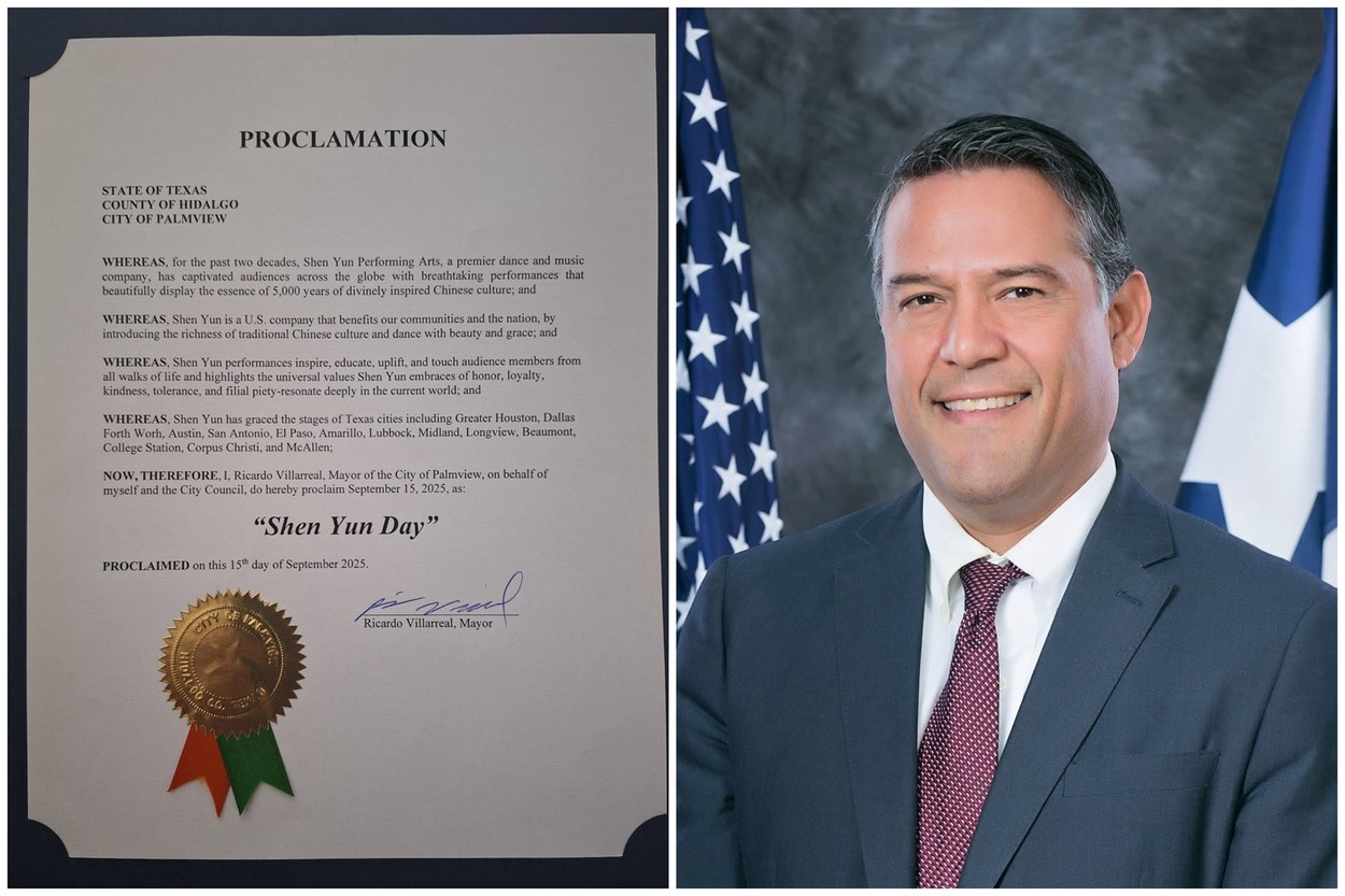 德克薩斯州棕櫚景市市長里卡多‧比利亞雷亞爾(Ricardo Villarreal)宣布,2025年9月15日為該市「神韻日」。(明慧網)