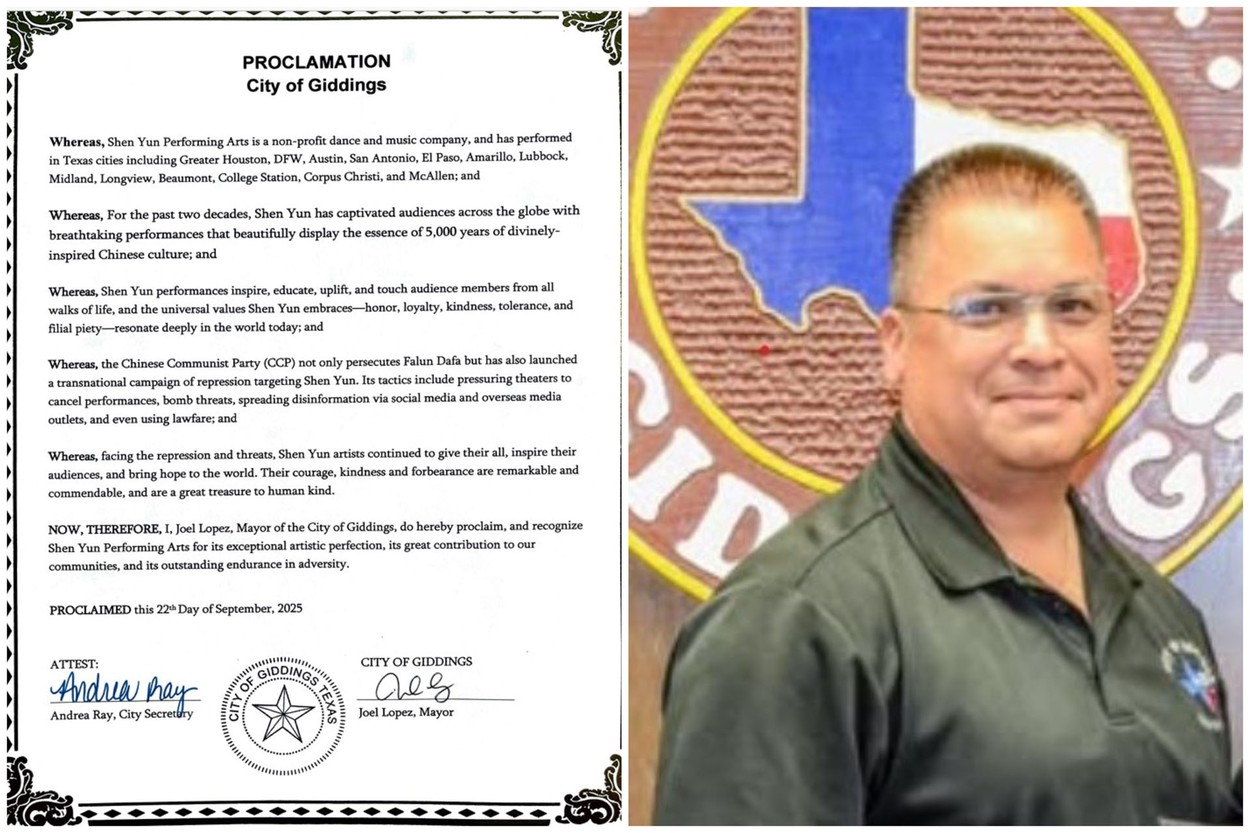9月22日,德克薩斯州吉丁斯市長喬‧洛佩茲(Joel Lopez)向神韻藝術團頒發褒獎。