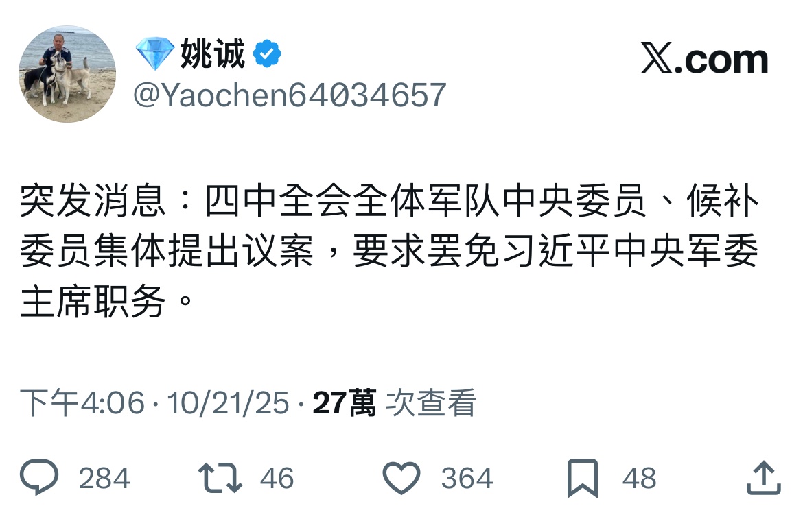 姚誠在今天(美東時間10月21日)下午,在X平臺上發佈這個突發消息。他說,四中全會全體軍隊中央委員、候補委員集體提出議案,要求罷免習近平的軍委主席職務。