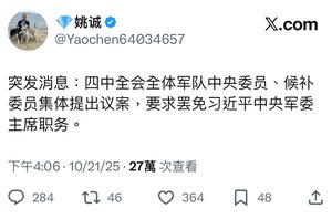 四中出大事!军方代表要求罢免习军委主席职务(图) 2025/10/22 (8,092次) 📝