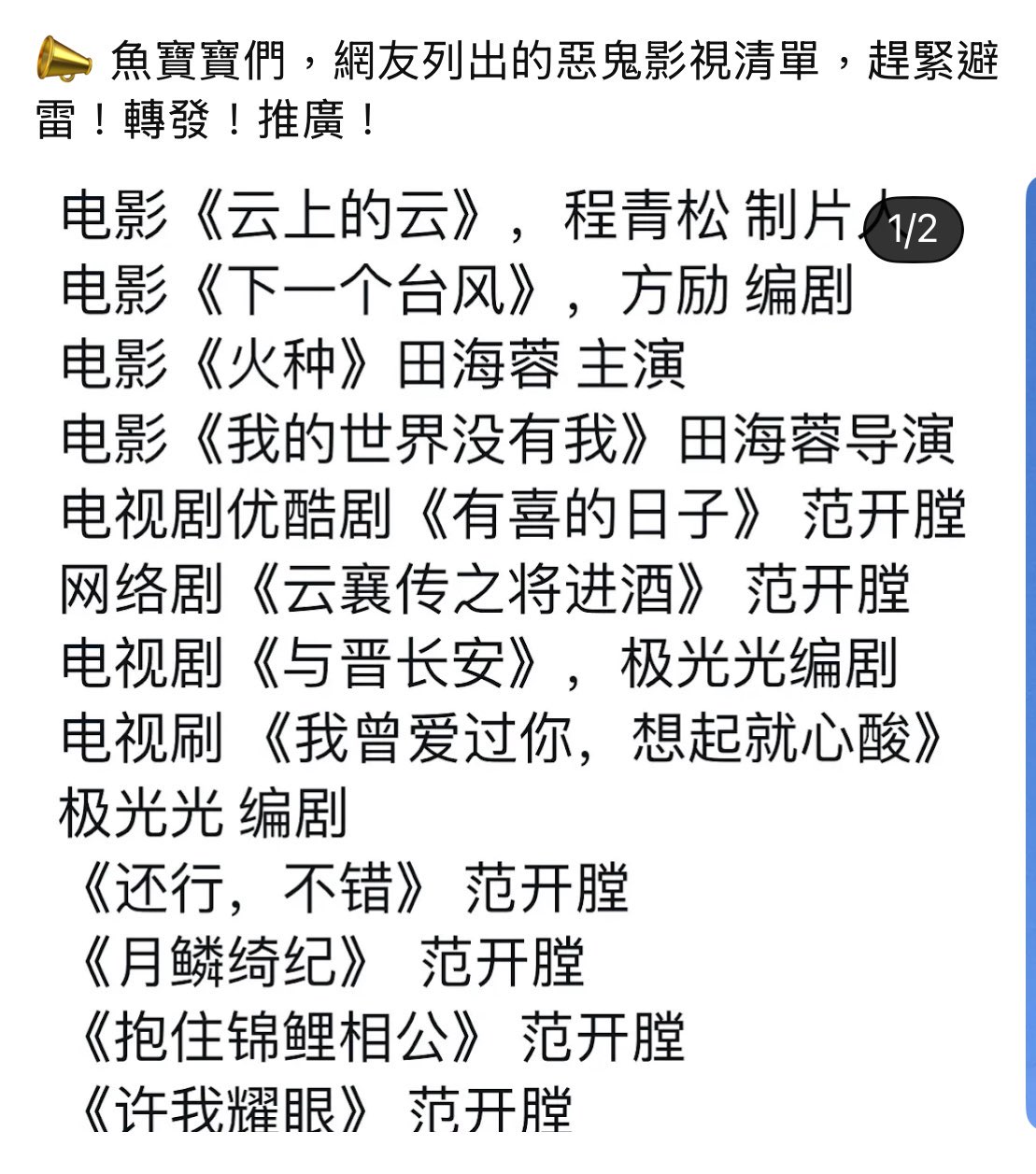 有粉絲列出了涉及于朦朧案的藝人的影視清單,並號召抵制。(網絡圖片)