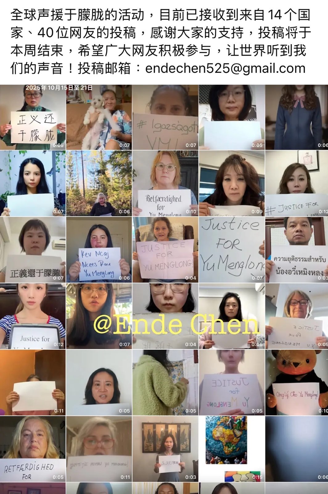 由海外中國民主黨舉辦的全球聲援于朦朧的行動,「讓世界聽到我們的聲音」,目前收到14個國家,來自40位網友的投稿。