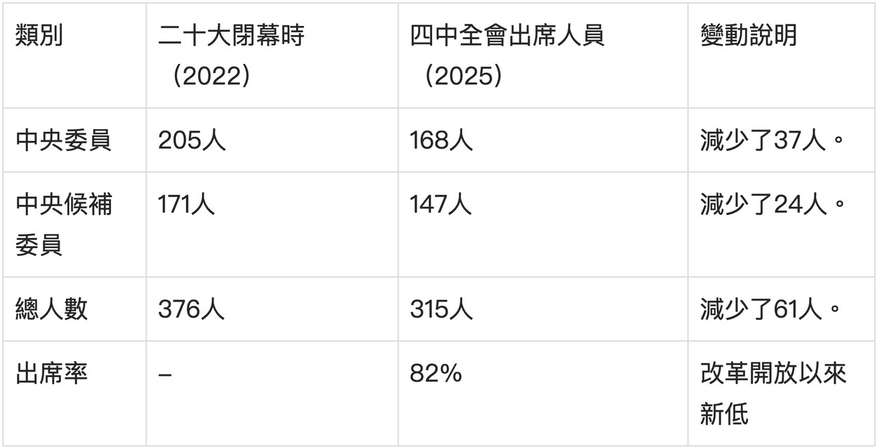 【人民報消息】這次中共二十屆四中全會10月23日閉幕,外界原本以為會是一次重大的人事「攤牌」,結果卻出人意料。會議結束後,沒有出現外界期待的高層調整,習近平保留了黨政軍三個職位。軍方卻只升了一個人。多個關鍵崗位仍然空缺,一批本該遞補的將領卻被集體「跳過」。會議缺席率創下歷史新高,留下許多謎團未解。 根據官方資料,二十屆中央委員會有205人,官方報導出席這次會議的只有168人,其中一人去世,36人缺席,只有10個人是公布被開除了黨籍,這樣剩下26個高官失蹤。按照慣例,這些人應該是出問題了。 二十屆中央候補委員還有171人,官方說出席這次會議的只有147人,24個缺席的「候補」委員 ,只有4個被正式公布開除黨籍,其它名單都沒有公布,很可能也是在黨內遭到清洗。 所以這次四中全會上,376個中央委員和候補委員,有61人缺席,其中一人是去世了,60人沒有出席,估計是出事了。 軍方數字更嚇人。開除黨籍的九上將,只有王厚斌不是中央委員——其餘全部是中央委員級別。根據央視畫面,軍方42個二十屆中央委員,共有27人缺席,當中上將有22人,除了官宣開除的8個上將,還有14個上將「失蹤」,他們是誰?他們到哪去了,背後發生了什麼? 關鍵數字比較: