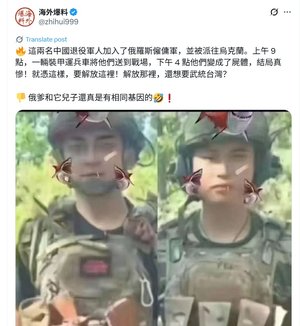 【人民报消息】(人民报记者金欣综合报导)经常在网络上看到中共小粉红动不动就叫嚣要攻打台湾,还说“不管打多久死多人,都会打下去”。然而,看完下面这名中国籍的俄罗斯雇佣兵在乌克兰战场的亲身经历后,是否还有人会真心希望发动台海战争? 俄乌战争后,网上不断传出中国人成为俄罗斯雇佣兵上战场的消息。近日,网传一名成为俄罗斯雇佣兵的中国小伙讲述恐怖战场经历,称不到一周1700人的军团就被全灭,自己认识的前线俄兵和中国籍雇佣兵“基本都死绝了”。 据看中国报导,10月6日,据网传多则视频消息指,从中国去俄罗斯当合同兵的一名男青年,自己“终于怂成狗”了,他重伤未死后亲自描述战场实况,恐怖经历令人惊悚,一个星期一个团1700人被消灭,这仗还能熬多久? 据视频中的男青年表示:俄罗斯一个团4月27号上战场,没人回来。自己所在的第二个团,4月29号也上战场,不到一个礼拜,全团1700人又打没了,“我是重伤”。反正跟自己认识的那些老毛子和国人,只要在前线的,“基本都死绝了”。 该青年称:真正往前冲的是“我们这些步兵”,跟著那种几百万卢布一台的便宜装甲车。战场上的队友不都是被对方打死的,有些是被自己的坦克和装甲车压死的。比如一发炮弹打在装甲车上会把人震倒,若倒在履带前面,会被活活的碾压,几十吨重的东西啊。 该青年称:大家只看得“我英雄的一面”,看不到“我吓得怂成狗”时的样子。战场“会战”要死人的,且死亡率相当高。自己真挺羡慕那时在二线背物资的日子,只用担心一下无人机就行,也不知道指挥官抽了什么筋,要去打会战。 该青年指:自己还没进到主战场就在前沿哨所时,看到那些受伤的士兵,蹬著眼躺在防空洞里同时惨叫。前沿哨这里,“地上那些尸体,比灰都多,五花八门,肠子肚子一地,发的霉的骨头,什么都有”。等越过雷区再前进一点,都中间,那里“尸体堆积如山,就连防空洞里面都有”,还有挖的那个战壕,“挤在战壕里面的尸体,比蚂蚁都多”。再顺著那些战壕前行,跳到战壕里,随便探个头都能看见尸体,要么就这么“挂著个手”。等怼到死尸的脸那更恐怖,活人跟尸体都在一起。他形容,自己能活著出来,“把自己熬的没有精神病”,那就是真的很牛了。