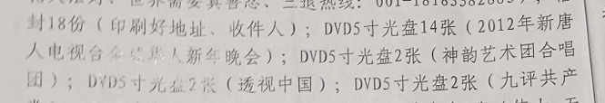 甘肅隴西縣法院2013年的一份判決書顯示,一名陳姓法輪功學員被冤判三年六個月。法庭文件上顯示被作為證據的扣押物品中,除有大法書籍、真相幣等資料外,有5寸DVD光盤14張(2012年新唐人電視台全球華人新年晚會),5寸DVD光盤2張(神韻藝術團合唱團演唱會)等。