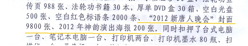 河北泊頭市法院2012年的一份判決書顯示,一名王姓法輪功學員被非法判刑三年。法庭文件上顯示的證據中,除了法輪功書籍、「真、善、忍」掛圖等,與神韻相關的證據包括《2012年新唐人晚會》光盤100張,《2012年新唐人晚會》封面9,800張、2012年神韻演出海報200張等。