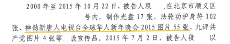 北京市順義區法院2017年的一份判刑書顯示,一名段姓法輪功學員被非法判刑一年半。法庭文件上顯示的判決依據是,在2000年至2015年的15年間,該男子製作了17張法輪功光盤、55張新唐人電視台2015年新年晚會(即「神韻晚會」)圖片、4張《九評共產黨》圖片,以及102個與法輪功相關的護身符。這些都成為了他被迫害的「罪證」。