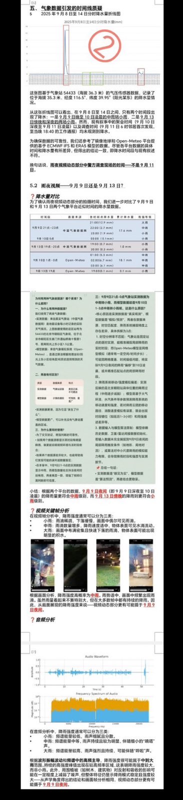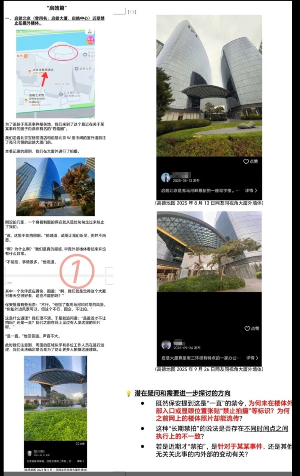 在“月下篇”里,有一个最重要的结论是,通过实地调查,环境拍摄,现有线索,气象数据以及视频画面和音频的交叉验证,并结合逻辑分析,确认广泛流传的雨夜视频拍摄时间可能为2025年9月9号,这个结论有力地反驳了普遍接受的9月11号案发时间。 “启皓篇”所涉及的地点,是嫌疑人在案发前后曾到访的区域。虽然目前还没有直接证据来证 这与案件存在确实关联,但我们在探查过程中发现该区域近期出现了多项疑似“掩人耳目”的改动,因此将其列为第二部分。