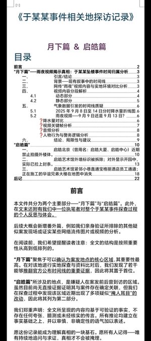 报告还郑重声明,全文所呈现的内容均属于可验证的事实,不存在任何夸张、臆测或未经核实的传言。所有推论都建立在事实基础上,并以审慎、非确定的语气加以表述。 整个报告 推理非常专业、逻辑严密,非常长。据分析,如果案发时间并非9月11号是9月9号,那么9月10号一整天,于朦胧处于什么状态,他在哪里呢?那些视频传出的惨叫声是否是于朦胧本人呢?所以,不管真凶是谁,目前这起案件最大的嫌疑就是警方,一直在掩盖真相的也是警方。警方为何至今没有出具任何案件内情,也就可以得到解释了。