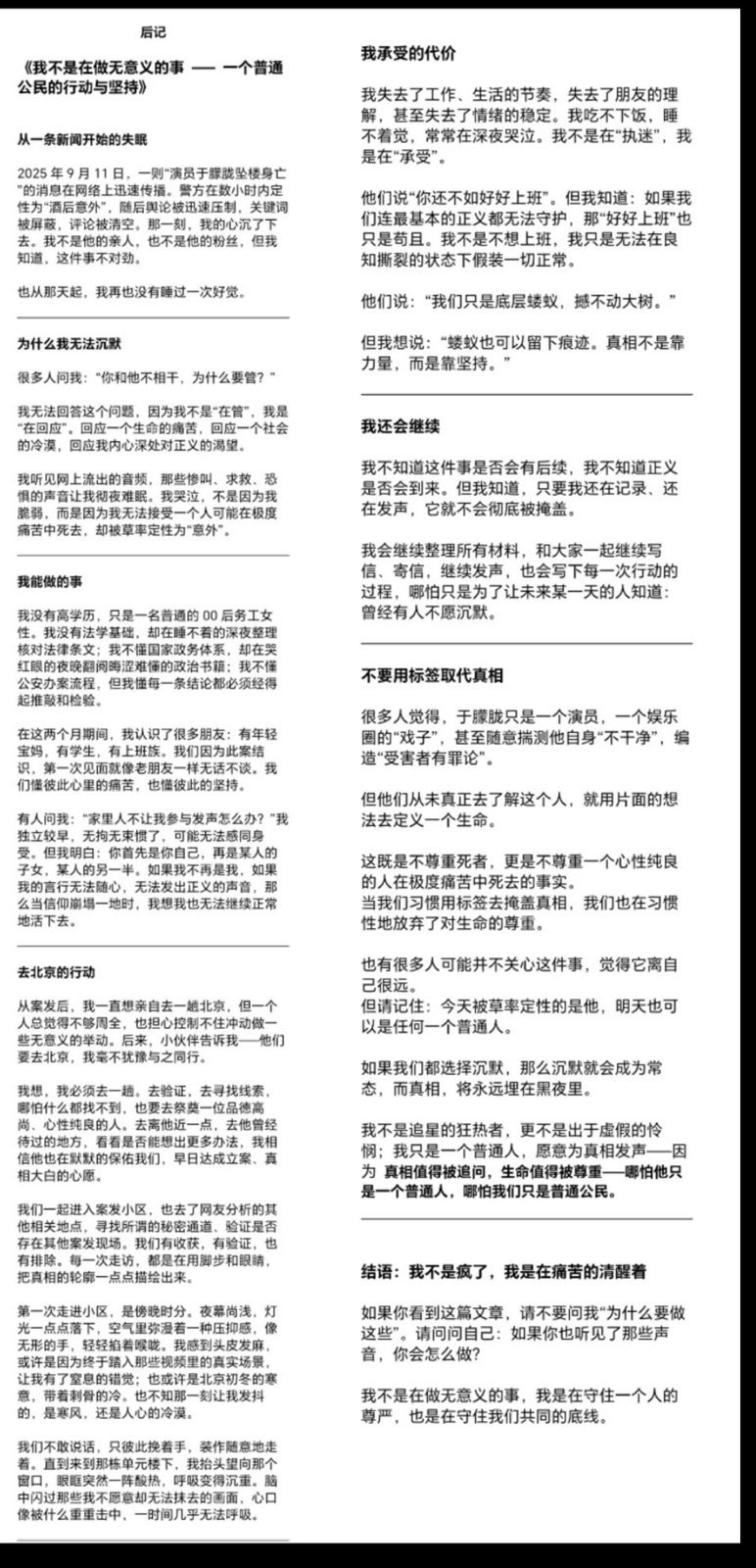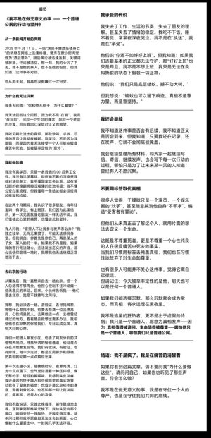 在“后记”中,作者这样写道:「从于朦胧离世那天起,我就再也没有睡过一次好觉。 作者说,她没有高学历,只是一名普通的00后务工女性。没有法学基础,但却在睡不著的深夜整理核对法律条文。不懂国家政务体系,却在哭红眼的夜晚,翻阅晦涩难懂的政治书籍。不懂公安办案流程,但对每一条结论都去推敲和检验。 很多人问:“你和他不相干,为什么要管?” 作者说:「我无法回答这个问题,因为我不是‘在管’,我是‘在回应’。回应一个生命的痛苦,回应一个社会的冷漠,回应我内心对正义的渴望。我哭泣,不是因为我脆弱,而是因为我无法接受一个人可能在极度痛苦中死去,却被草率定性为意外。 有人说:我们只是底层蝼蚁,撼不动大树。 但作者回答,蝼蚁也可以留下痕迹。真相不是靠力量,而是靠坚持。哪怕只是为了让未来某一天的人知道,曾经有人不愿沉默。 作者表示,她们只是普通人,愿意为真相发声,是因为真相值得被追问,生命值得被尊重——哪怕他只是一个普通人,哪怕我们只是普通公民。 作者的最后的结语是:我不是疯了,我是在痛苦的清醒著。 这位作者真的是让人既感动又钦佩。实际上,网友们发声为好人讨公道,是为了公平正义。大家的目的始终是一致的。现在要做的就是,墙内努力写信,打电话,外网努力发声,签连署。这次,我们不问国籍,只问真理。 △