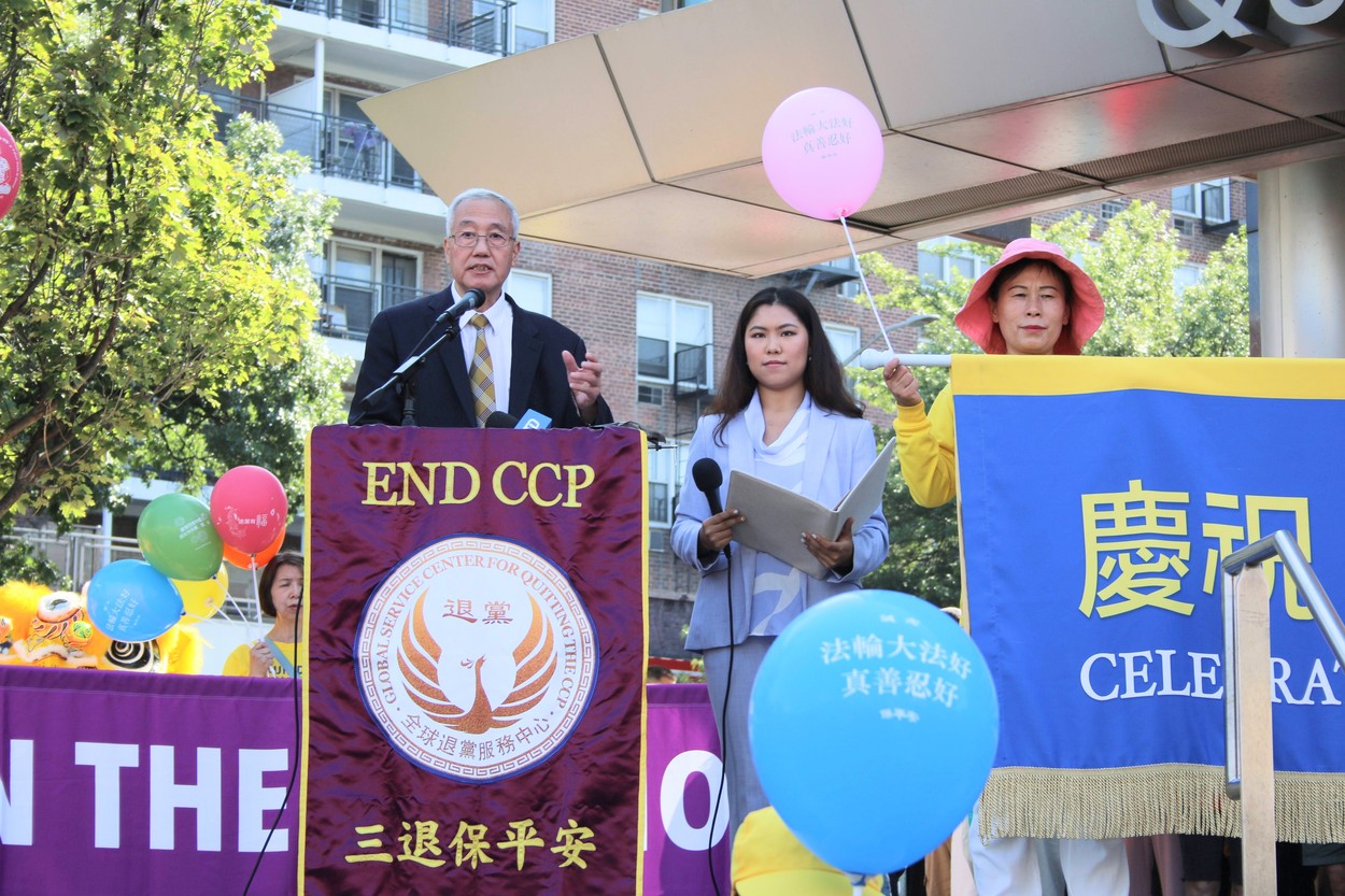2025年8月10日上午,汪志远在纽约法拉盛庆祝三退人数逾4.5亿人的集会和活动现场讲话。(黄小堂/大纪元)