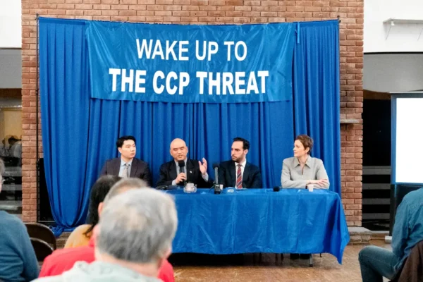 2023年3月22日,纽约州沃里克市(Warwick),(从左到右)张大卫(David Zhang)、林晓旭(Sean Lin)(左二)、克里斯‧查普尔(Chris Chappell)和凯‧鲁巴塞克(Kay Rubacek)出席当地举行的“警惕中共威胁”研讨会上。中共政权扩大影响力的迹象在YouTube上越来越明显,尤其是在英语节目当中。(Cara Ding/The Epoch Times)