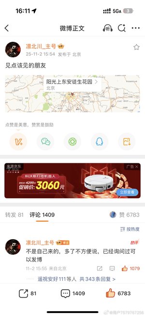11月3號,凜北川發帖說,他去陽光上東小區見幾個人。(網絡圖片)