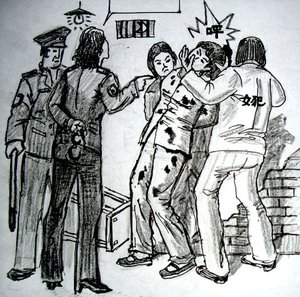 中共酷刑示意图:殴打、撞头。(明慧网)
