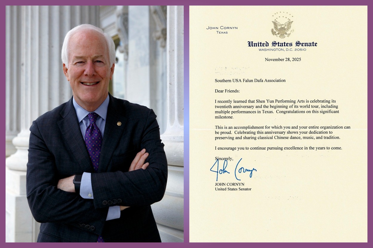 美国资深联邦参议员约翰‧科宁(John Cornyn)于11月28日向神韵德州主办方发来贺信,祝贺神韵艺术团迎来二十周年的重要里程碑。(大纪元合成)