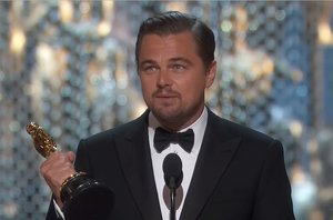 2016年,李奧納多被評為第88屆奧斯卡最佳男主角。圖為李奧納多在領獎臺上。(視頻截圖)
