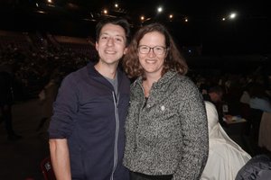 2025年12月18日,Robert Schaus(右)與朋友Gareth Konijnenberg從盧森堡專程驅車到阿姆內維爾,觀看了神韻國際藝術團的演出。(張妮/大紀元)