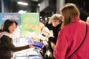 2025年12月18日,觀眾在阿姆內維爾大劇院(Galaxie Amnéville)內購買神韻商品和《轉法輪》等書籍。(章樂/大紀元)