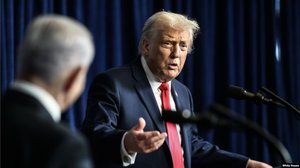 唐納德.川普總統在佛羅里達州棕櫚灘的海湖莊園與以色列總理本雅明.內塔尼亞胡舉行雙邊記者會。(2025年12月29日)