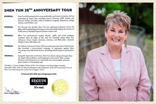 【人民報消息】神韻藝術團即將在2026演出季中,迎來巡迴演出20周年。美國德克薩斯州繼六城市嘉獎神韻(請看這裡 )後,又有埃爾帕索市(El Paso)、加蘭市(Garland)、麥卡倫市(McAllen)、朗維尤市(Longview)、塞金市(Seguin)和伯尼市(Boerne)六座城市的市長,代表市議會向神韻致贈褒獎。