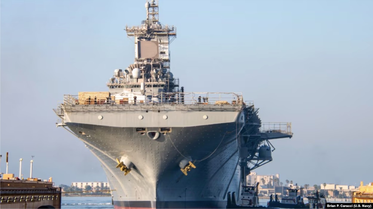 资料照片:美国海军两栖攻击舰“埃塞克斯”号离开贝宜系统公司位于加利福尼亚州圣迭戈的干船坞。(2023年9月8日)