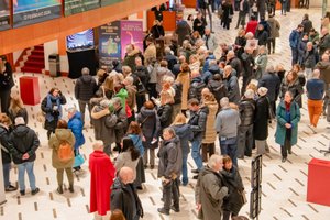 2026年1月16日晚,神韵纽约艺术团在意大利米兰的阿尔钦博第剧院举行在当地的第四场演出,全场再次爆满。图为等待入场的部分观众。(Gabriele Bruno/大纪元)