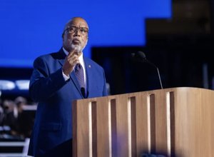 2024年8月21日,美國密西西比州眾議員本尼‧湯普森(Bennie G. Thompson)在芝加哥舉行的2024年民主黨全國代表大會上發表講話。(John Fredricks/英文大紀元)