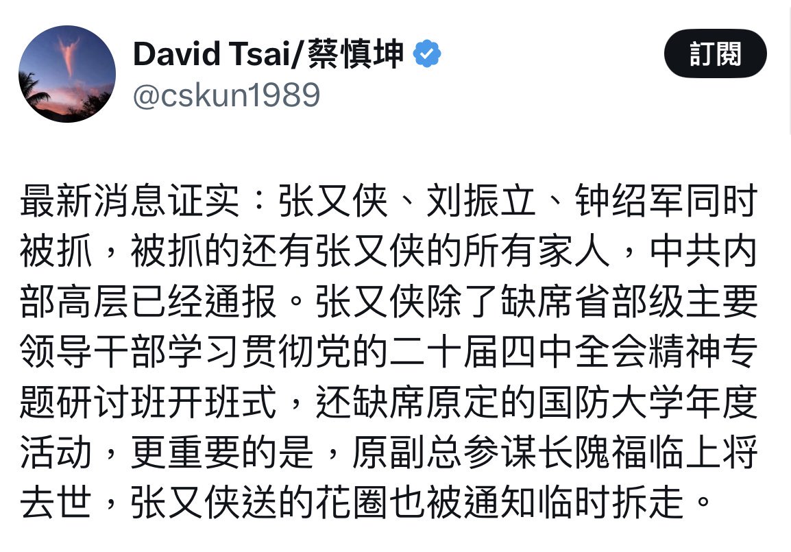 但是,独立评论人士蔡慎坤在美东时间1月21日晚上11点多,在X上传出了最新消息证实:张又侠、刘振立、钟绍军同时被抓,被抓的还有张又侠的所有家人,中共内部高层已经通报。张又侠除了缺席省部级主要领导干部学习贯彻党的二十届四中全会精神专题研讨班开班式,还缺席原定的国防大学年度活动,更重要的是,原副总参谋长隗福临上将去世,张又侠送的花圈也被通知临时拆走。
