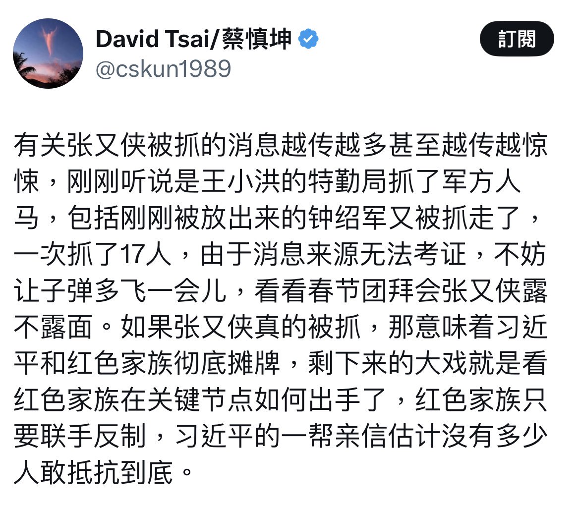 他发帖说:“刚刚听说是王小洪的特勤局抓了军方人马,包括刚刚被放出来的钟绍军又被抓走了,一次抓了17人,由于消息来源无法考证,不妨让子弹多飞一会儿,看看春节团拜会张又侠露不露面。如果张又侠真的被抓,那意味著习近平和红色家族彻底摊牌,剩下来的大戏就是看红色家族在关键节点如何出手了,红色家族只要联手反制,习近平的一帮亲信估计没有多少人敢抵抗到底。”