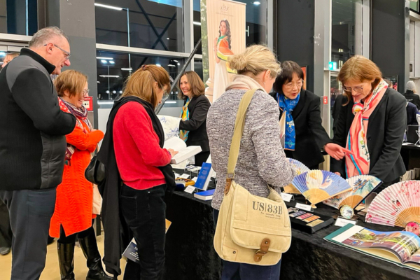 美國神韻巡迴藝術團於2026年1月22日在奧地利首都維也納市政廳劇院F大廳(Wiener Stadthalle, Halle F),上演了今年在當地的首場演出。觀眾對法輪大法書籍很感興趣。(安然/大紀元) △