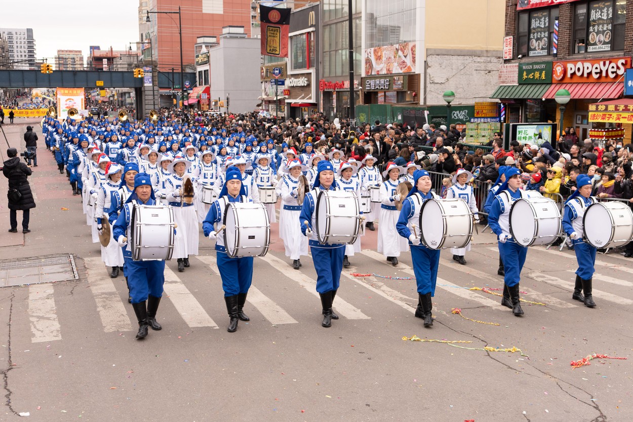 2月21日丙午马年大年初五,法轮功学员参加纽约法拉盛大游行,图为第一方阵天国乐团。(戴兵/大纪元)