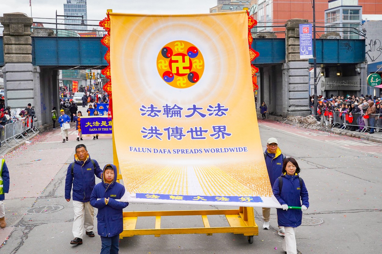 2月21日丙午马年大年初五,法轮功学员参加了纽约市最大华人聚居地——法拉盛一年一度的中国新年大游行活动。(戴兵/大纪元)