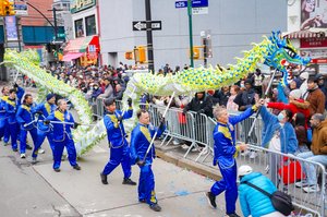 2026年2月21日丙午马年大年初五,法轮功学员参加纽约法拉盛中国新年游行,带去美好和祝福。图西人舞龙队。(张静怡/大纪元)