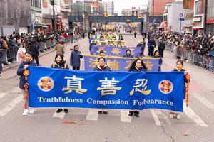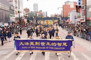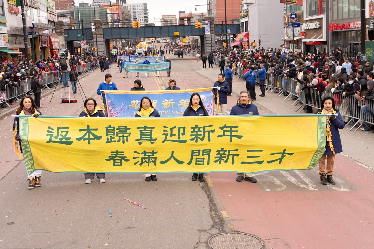 【人民报消息】“返本归真迎新年,春满人间新三才”,2月21日,丙午马年大年初五,纽约中国新年大游行在北美最大的华人社区法拉盛举行,观众人山人海。 法轮大法团体共襄盛举,队伍壮观,色彩缤纷,中华文化气息浓郁,展现法轮大法和“真、善、忍”的美好,给民众带来喜庆、祥和和祝福。有观众说:希望法轮功回到中国大陆游行。 法轮功队伍壮观 《辞旧迎新祝愿歌》在街头回荡 始于1996年的法拉盛新年游行,是北美地区规模最大的新年游行,今年踏入30周年的里程碑,场面喜庆、热闹,法拉盛中心区锣鼓声声、龙腾狮跃,贺岁声不绝于耳。 法轮功团体每年参加这个游行,已有二十多年,给华人和各族裔的民众拜年送福。他们的队伍流光溢彩,中华传统文化色彩浓厚。 法轮功的队伍有气势如虹的天国乐团、“天宫仙境”花车、喜庆的舞龙舞狮、威震十方的太鼓、婀娜多姿的莲花舞蹈、步伐整齐的旗阵、英姿飒爽的腰鼓队⋯⋯多姿多彩,亮丽纷呈,让人目不暇接。 特别是身穿古代将士服饰的天国乐团一出场,立即震撼全场,鼓乐齐鸣,响彻云霄,气势磅礴,如万马奔腾,巨大的慈悲能量场覆盖街区,街上两旁观众的眼睛聚焦,他们纷纷举起手机拍照、录像。