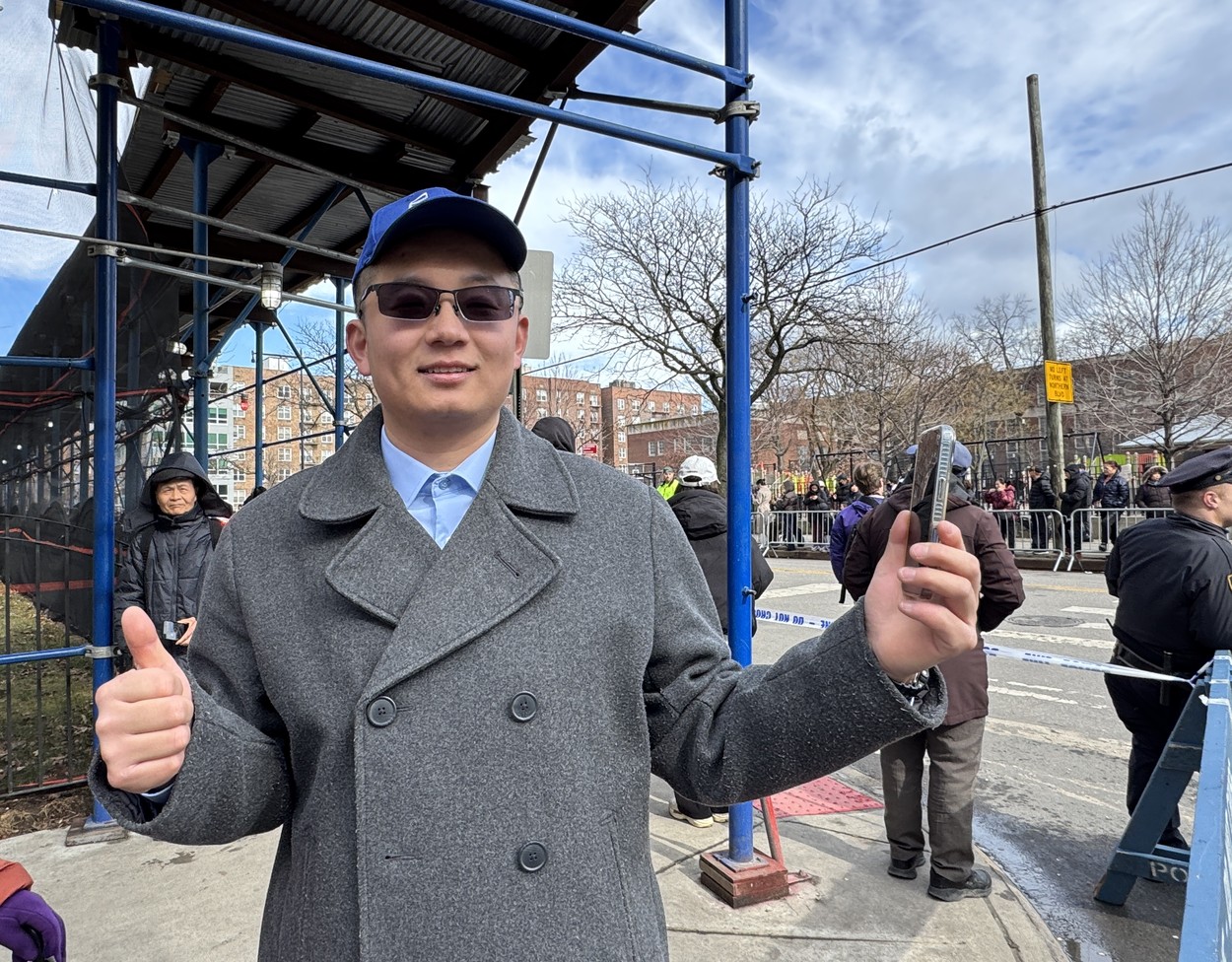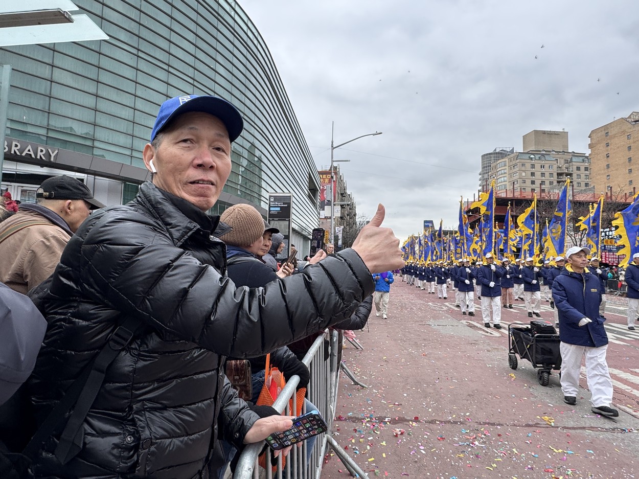 法轮功的队伍中一首喜庆、欢快的《辞旧迎新祝愿歌》不断在街头回荡,给民众送福:“愿你得平安,愿你结善缘,愿你时刻存善念,越走路越宽。法轮大法好,字字金光闪,愿你记住真善忍,来年再相见!” 中西族裔民众人山人海 盛赞法轮功 法拉盛中心区的人流量每天超过10万人次,是仅次于纽约时代广场的纽约市最繁华的社区,观看游行的中西族裔民众人山人海,扶老㩦幼,在Main街上挤得里三层外三层。他们的脸上洋溢著笑容,纷纷对法轮功学员的队伍赞不绝口。 “每年最期待法轮功队伍!”
