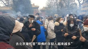大年初一,北京雍和宮徹夜排隊燒香,到寺廟的年輕人越來越多。(視頻截圖)