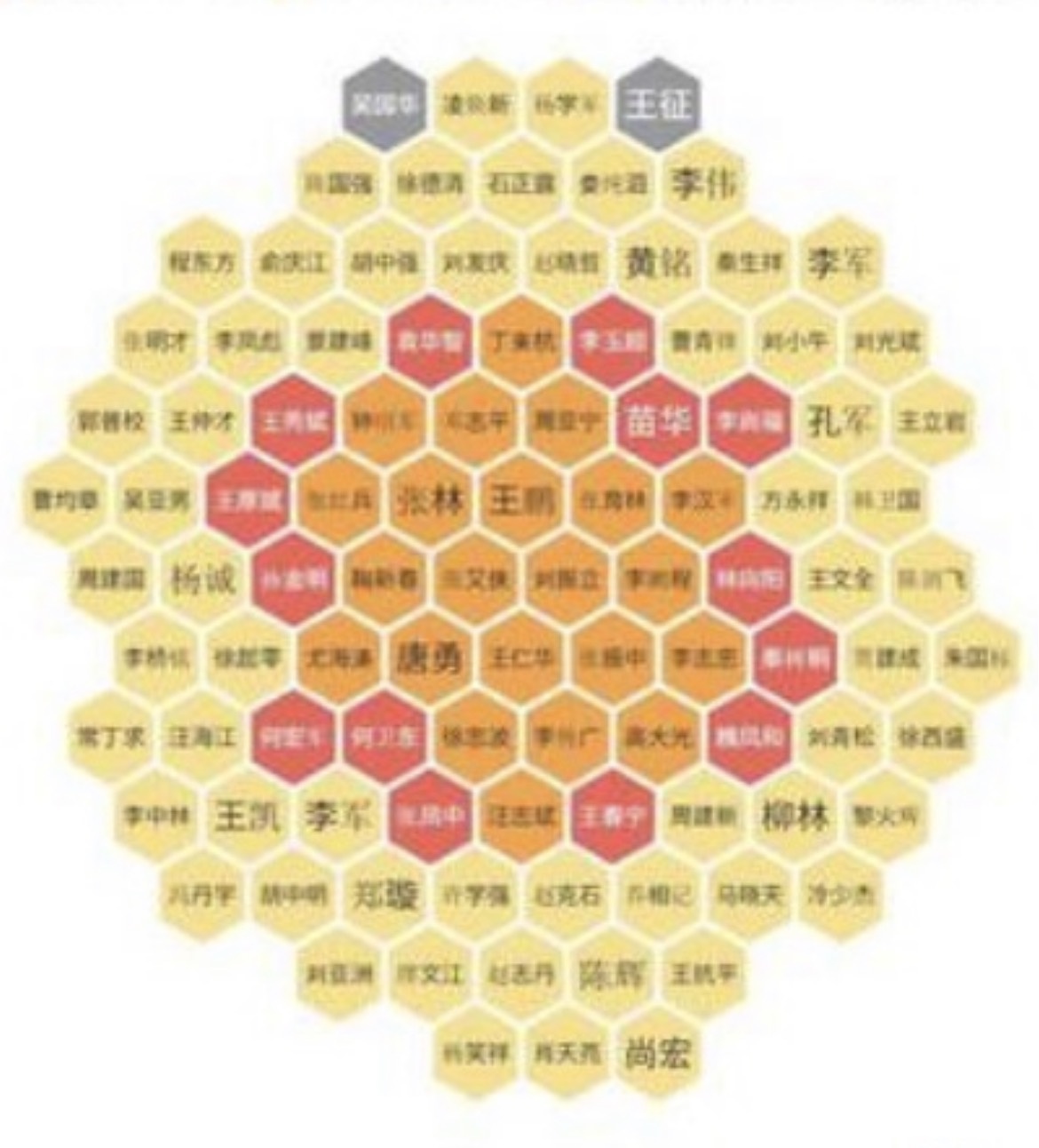 据《自由时报》报道,这张图表中,密密麻麻地布满了101个多边形,每一个蜂巢单元就代表一名落马或疑似落马的高级军官。图表用颜色区分了这些官员的命运:红色代表被开除党籍,橘色是被撤职,灰色代表已被肃清或S亡。但最引人注目的是那一厚片的黄色,这代表这些官员目前“下落不明”或正在接受调查。报告指出,共军176个高层职位中,受影响的比例竟然高达 52%,这意味著超过一半的高层领导层都换过人,或是位置空著。