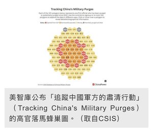 【人民報消息】(人民報記者程曦報導)大家最近有沒有聽說一張「蜂巢圖」?這張圖不是什麼高科技產品,而是美國智庫 CSIS 最新發布的共軍「高官落馬圖」。根據這份報告,共軍內部正在經歷一場比外界想像中還要嚴重、規模甚至可以說是「史無前例」的大清洗。習近平自毀長城,但同時也表現出他的破壞力驚人,沒有辜負「加速師」的稱號。 「蜂巢圖」——習近平自毀長城 據《自由時報》報道,這張圖表中,密密麻麻地佈滿了 101 個多邊形,每一個蜂巢單元就代表一名落馬或疑似落馬的高級軍官。圖表用顏色區分了這些官員的命運:紅色代表被開除黨籍,橘色是被撤職,灰色代表已被肅清或S亡。但最引人注目的是那一厚片的黃色,這代表這些官員目前「下落不明」或正在接受調查。報告指出,共軍176個高層職位中,受影響的比例竟然高達 52%,這意味著超過一半的高層領導層都換過人,或是位置空著。