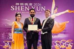 【人民報消息】2026年2月26日下午,神韻環球藝術團在英國海威科姆的威科姆天鵝劇院(Wycombe Swan Theatre)上演了在當地的第五場演出,劇院持續爆滿。海威科姆市長Majid Hussain向神韻藝術團頒發了表彰證書,以感謝神韻為當地做出的文化貢獻。