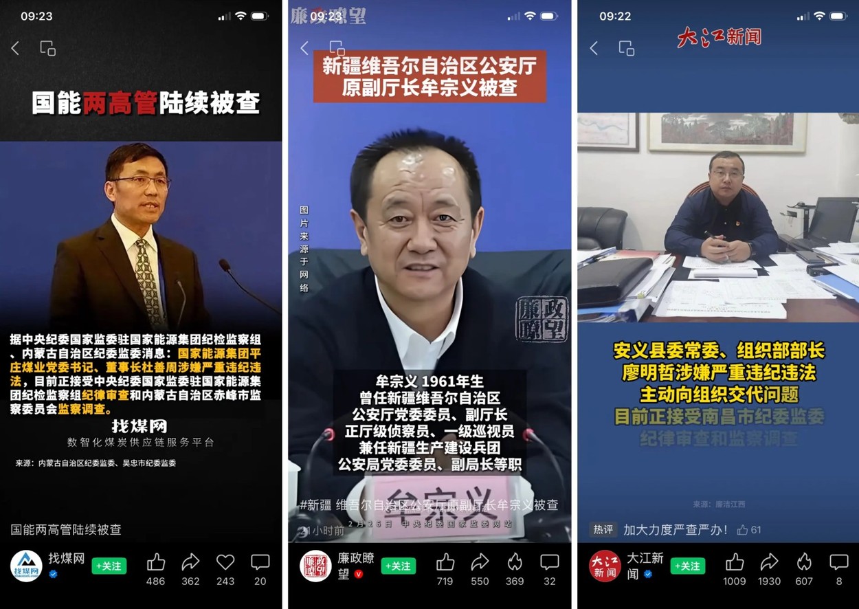 过去两天,中共纪检系统罕见密集发布通报,金融监管系统、央企能源板块、公安系统及多地党政干部相继被查或遭“双开”。(网页截图)