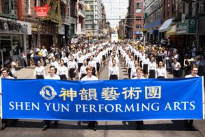 2025年7月20日,大纽约地区数千名法轮功学员在曼哈顿中国城举行“停止迫害法轮功”大游行。数百名神韵艺术家及工作人员组成方阵也加入到游行队列。(戴兵/大纪元)