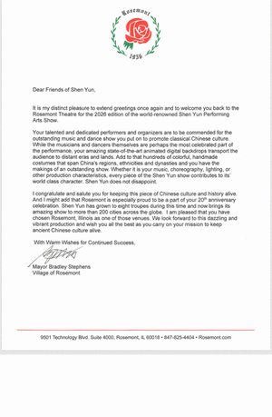 大芝加哥北郊罗斯蒙特(Rosemont)市长Bradley Stephens为神韵2026年在罗斯蒙特剧院的演出发出贺信。(大纪元)