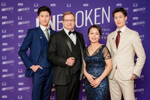 2026年4月22日晚间,纪录片《坚不可摧》于多伦多举行盛大的红毯首映。片中主要人物Levi Browde与妻子倪碧莹和两个儿子出席首映式。(艾文/大纪元)