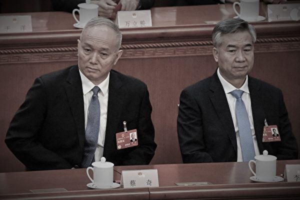 圖為2023年3月12日,中共政治局常委蔡奇(左)和李希(右)出席中共人大會議。(Noel Celis/AFP)